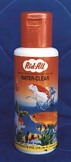 ![]() | "RID-ALL" WATER CLEAREliminates cloudy water caused by floating dirt, algae, protein and bacterialblooms in fresh water or marine aquariums. It will cause cloudy water andmilky haze water to coagulate to form layered particles that can be removedby normal filtering.DIRECTIONS: Use 5 ml. to 25 litres of water If water remains cloudy, add more Water-Clearuntil it becomes clear. It serves only to clear the water. A tank suddenlyturning cloudy is a warning that something is not right - possibly due toa dead fish. overfeeding, overcrowding, or the filtering systems need cleaning.Such problems should be eradicated first before applying Water-Clear, otherwisethe water will become cloudy again soon after it turns clear NOTES: