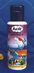 ![]() | "RID-ALL" BROAD SPECTRUM ANTI-FUNGUSUse the latest chemicals that are effective against tail and finrot, fishand egg fungi, mouth fungus, white spots, flukes and veivet, fin and skinturbidity or cloudiness and external injuries.SPECTRUM OF ACTION: Effective against diseases caused by Ichthyophthirius spp.(whiste spots),Costia spp., Trichodina spp., Trichodinella spp., Chilodonella spp. (protozoanparasites - main cause of white spots and sliminess of the skin), Saprolegniaspp., (cotton-like threads grow on gill filaments fish and egg fungi), Trichodinellaspp., Flexibacateria (cotton-wool disease or mouth fungus), Cryptobia spp.,and Trypanosoma spp., (listless behavour, emaciation and "pop eye"). DIRECTIONS: Use 5 ml. (One teaspoonful) to every 25 litres of water. For bigger fishsuch as Carps, Cichlids, Gold Fish, Gourami, Koi, Oscars, Parrot Fish andin severe fungi infections use 10 ml. (two teaspoonful) if necessary. Totreat external injuries dab the affected areas with undiluted ANTI-FUNGUS. CAUTION: Some fish, such as "scaleless catfish", tetras and some charachinsmay not tolerate this remedy very well. Use half the dose and remove thefish immediately to clean and well aerated water at first sign of distress. PACKINGS: